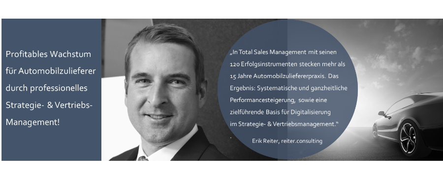 Total Sales Management vereint für eine ganzheitliche und systematische Herangehensweise das Wissen aus langjähriger internationaler Automotive-Managementerfahrung und den bewährten, zielführenden Management-ansätzen von Harvard bis St. Gallen. Spezifisch für Automobilzulieferer entwickelt, um profitables Wachstum durch professionelles Strategie- & Vertriebsmanagement zu erzeugen.